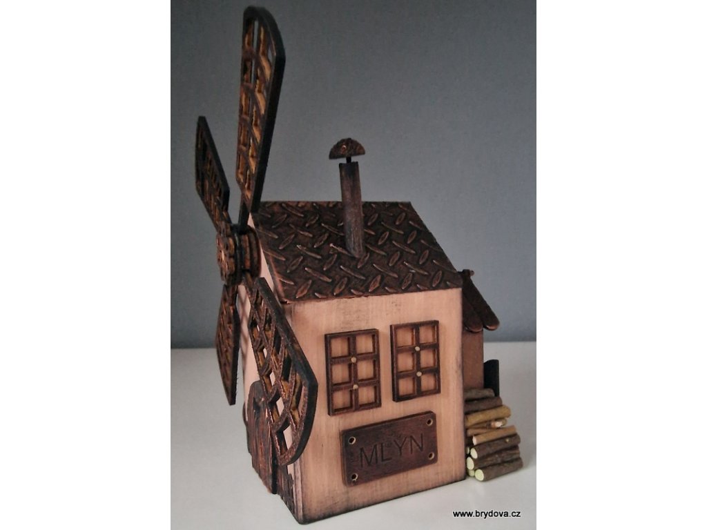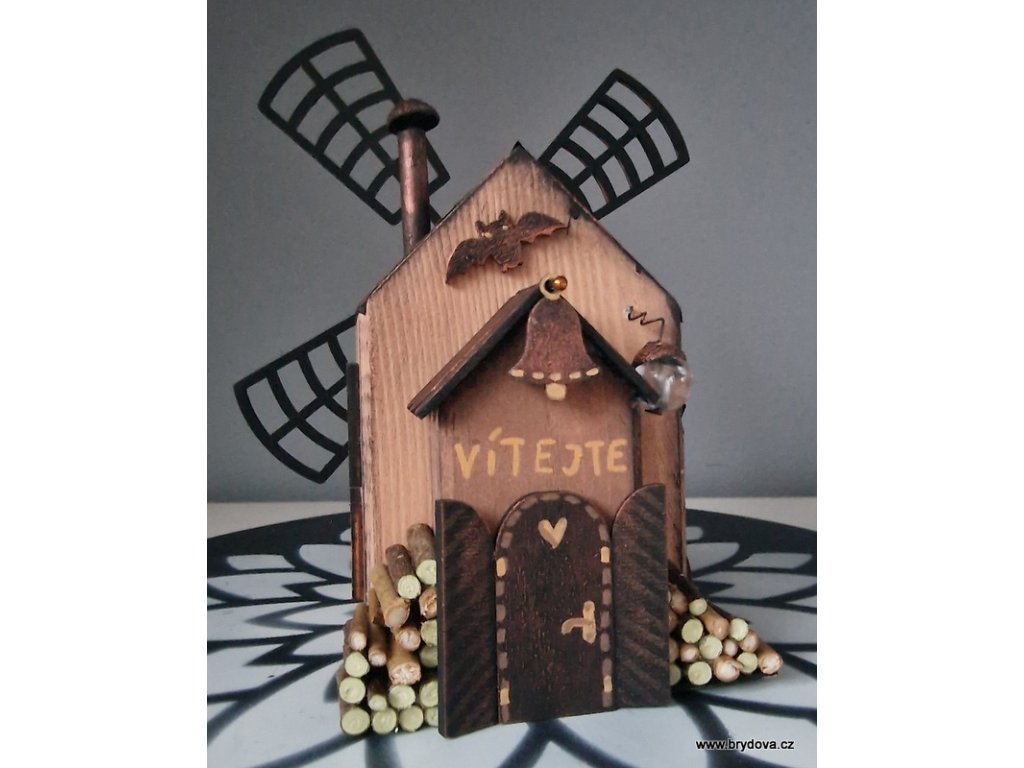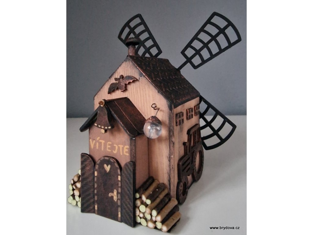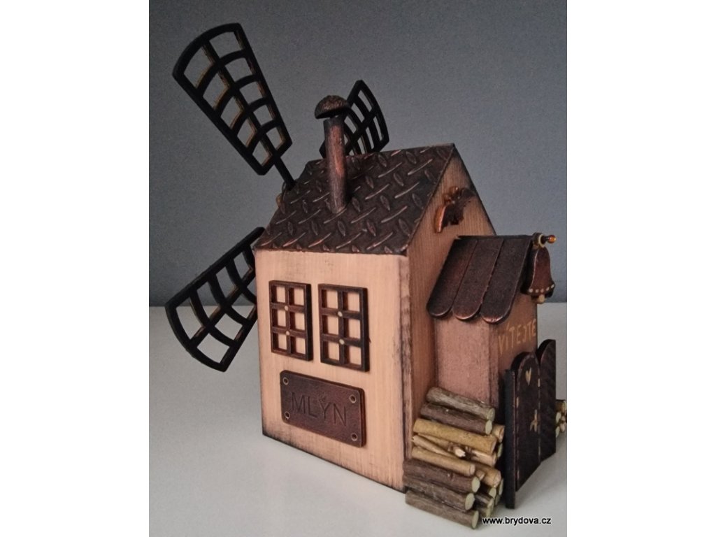 Dřevěný autorský domek - mlýn - mlýnské kolo je slepené a posílám ho zvlášť - stačí přilepit na připravenou oboustrannou pásku - velikost 12 × 8 × 8 cm plus lopatky ve velikosti 18 × 18 cm