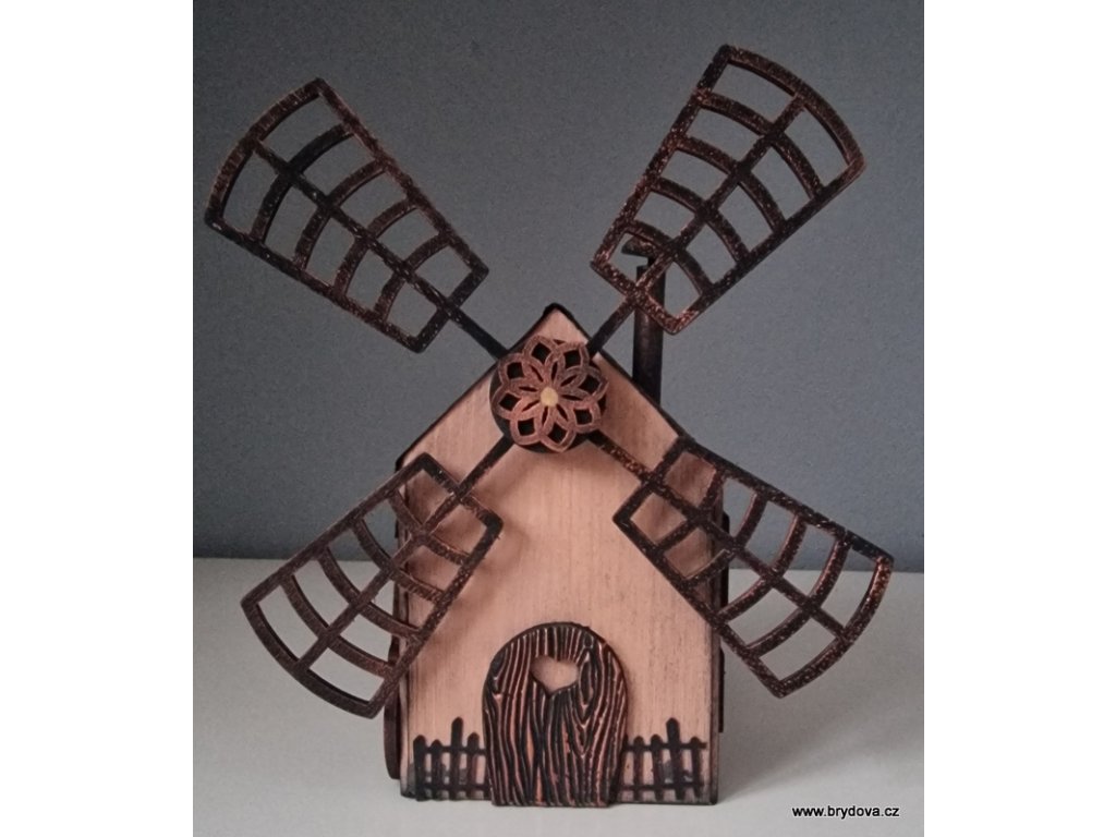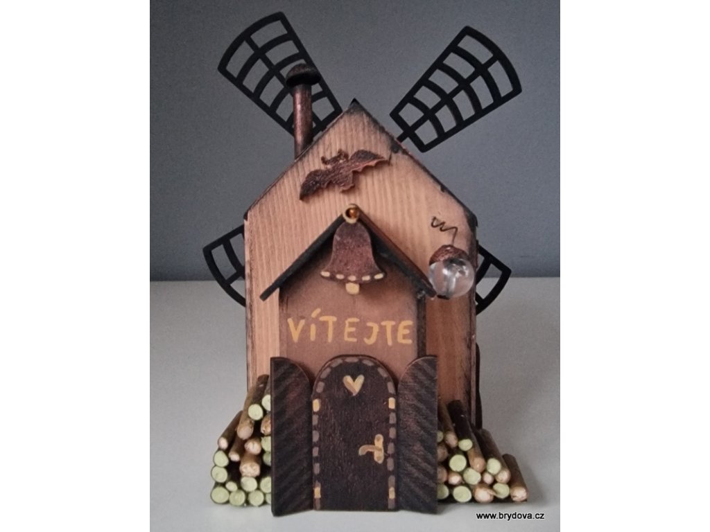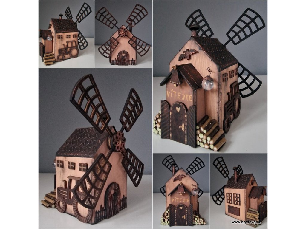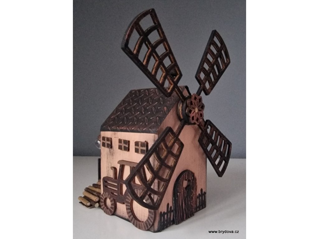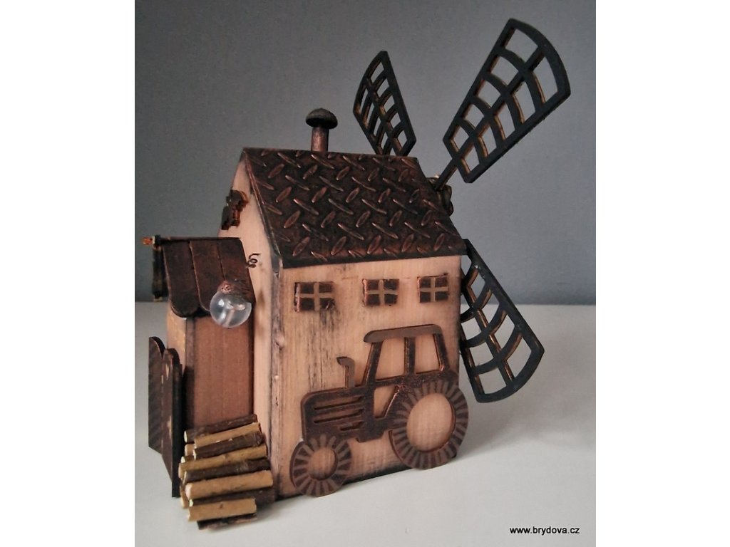 Dřevěný autorský domek - mlýn - mlýnské kolo je slepené a posílám ho zvlášť - stačí přilepit na připravenou oboustrannou pásku - velikost 12 × 8 × 8 cm plus lopatky ve velikosti 18 × 18 cm