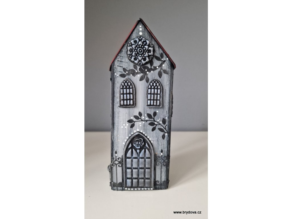 Autorský domeček, šedý s plastickými gotickými okny - velikost 20 × 7 × 4 cm