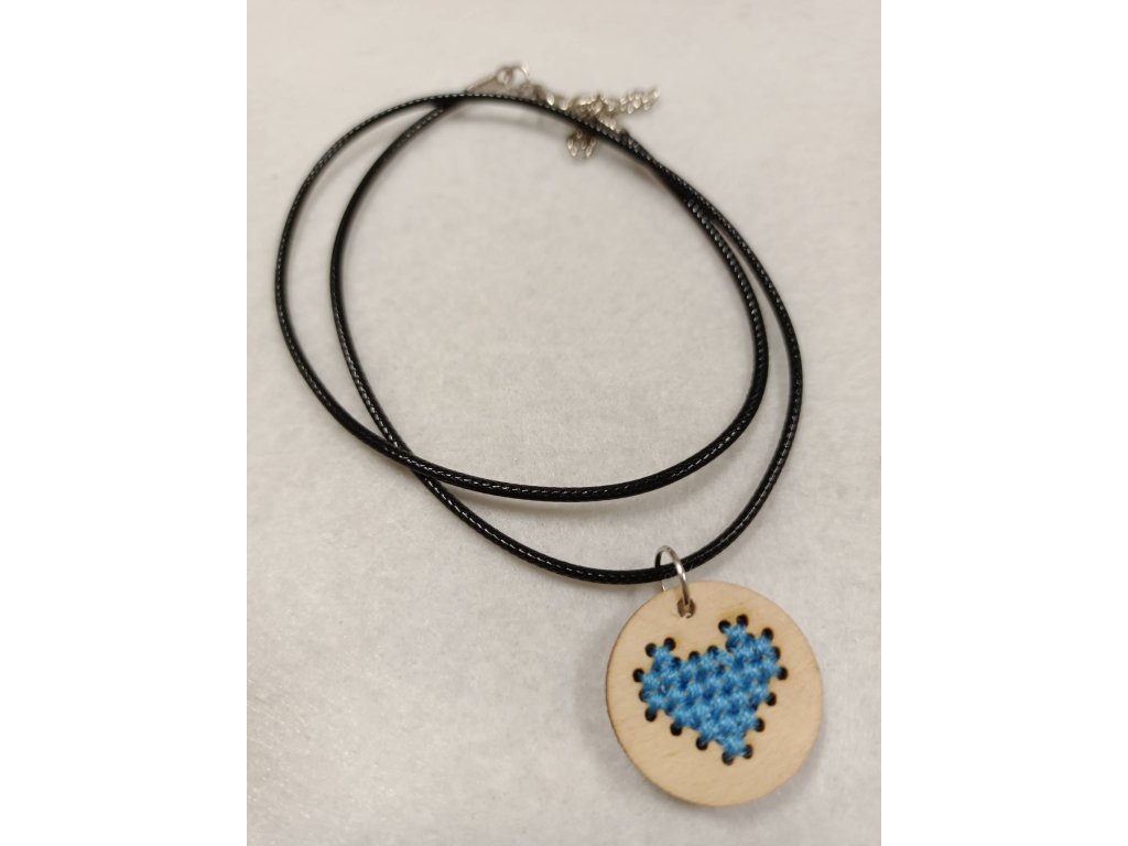 Dřevěný výřez s křížkovou výšivkou o průměru 2,2 cm. Délka šňůrky 48 cm.