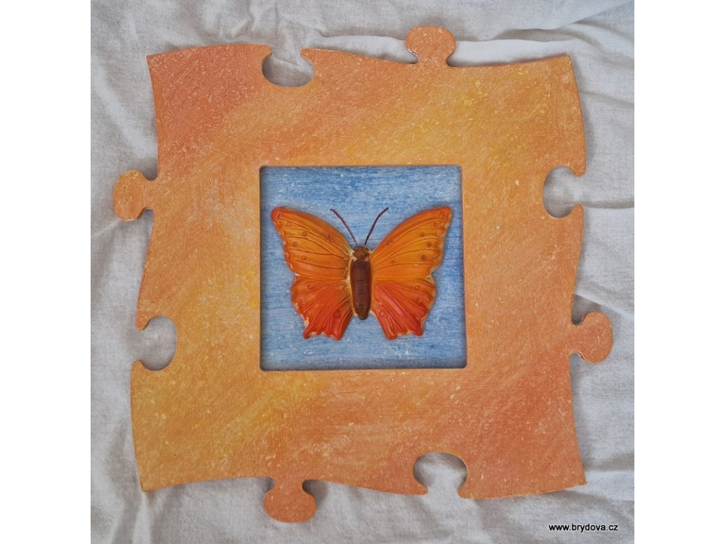 Autorský obraz - dřevěný rám ve tvaru puzzle - 24 × 24 cm - zdobený speciálními barvami a uvnitř prostor 10 × 10 cm s plastickým motýlem