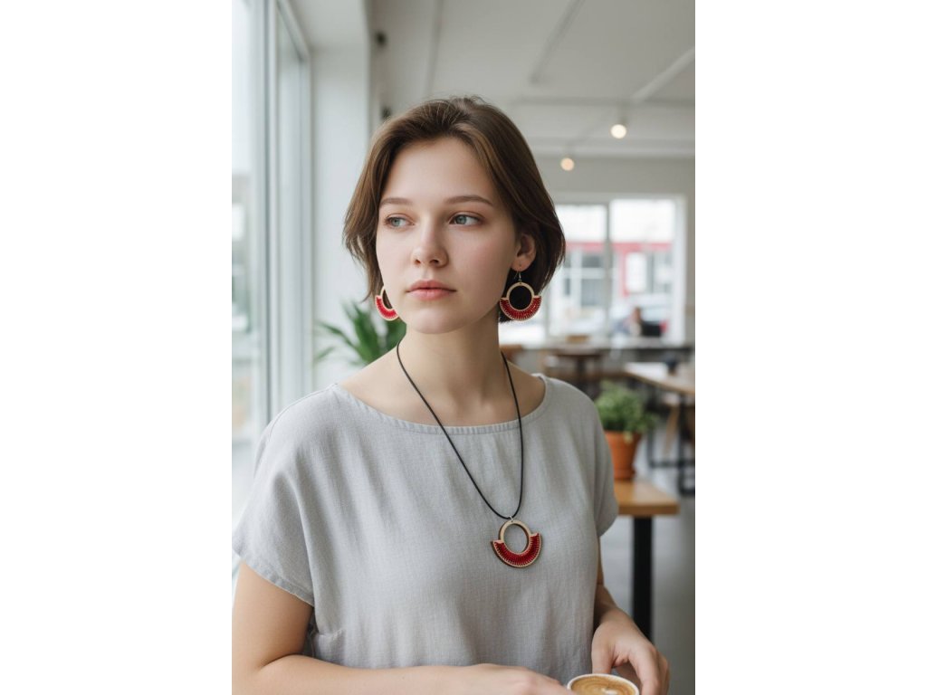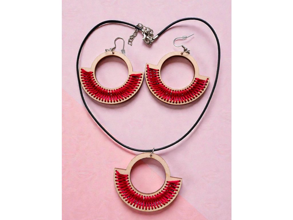 Dřevěný výřez o velikosti 4,5 × 5,5 cm, délka šňůrky 48 cm. Vyšito bavlnkou, bižuterní kov. Náušnice jsou lehoučké jak pírko.