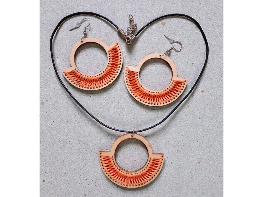 Dřevěný výřez o velikosti 4,5 × 5,5 cm, délka šňůrky 48 cm. Vyšito bavlnkou, bižuterní kov. Náušnice jsou lehoučké jak pírko.