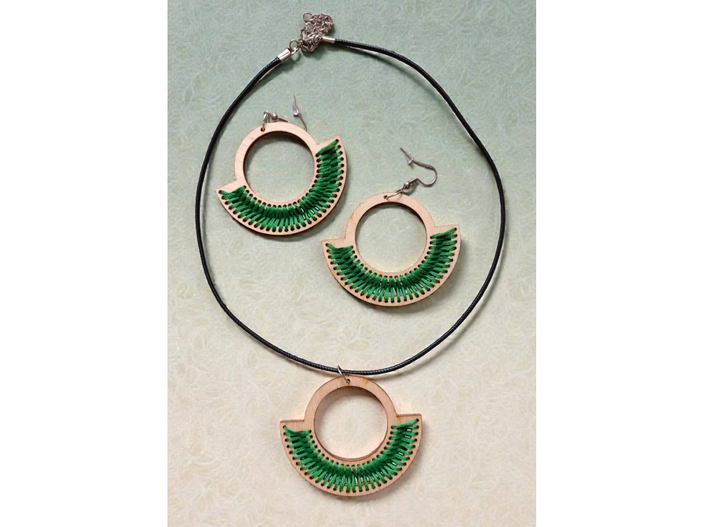 Dřevěný výřez o velikosti 4,5 × 5,5 cm, délka šňůrky 48 cm. Vyšito bavlnkou, bižuterní kov. Náušnice jsou lehoučké jak pírko.
