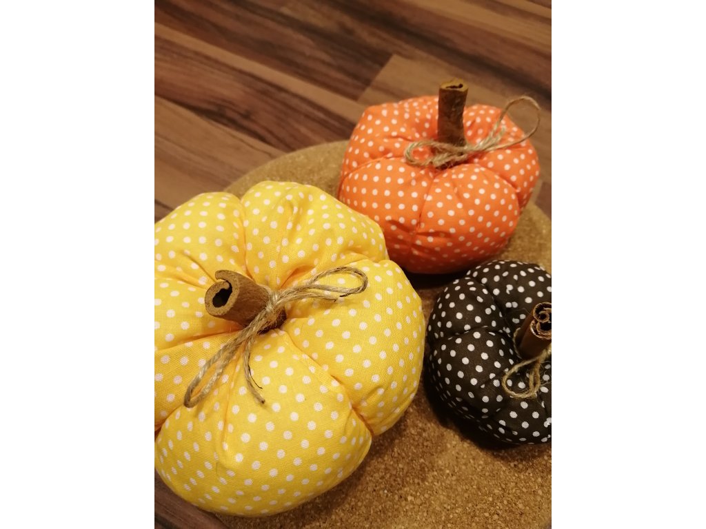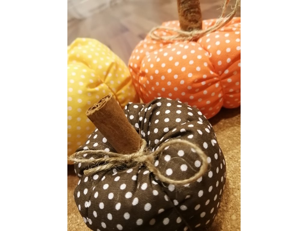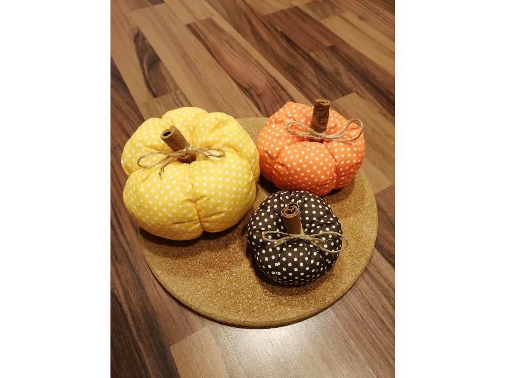 Sada ručně šitých látkových dýní, žlutá průměr 11 cm, oranžová 9 cm a hnědá 7 cm. Stopka ze skořice.