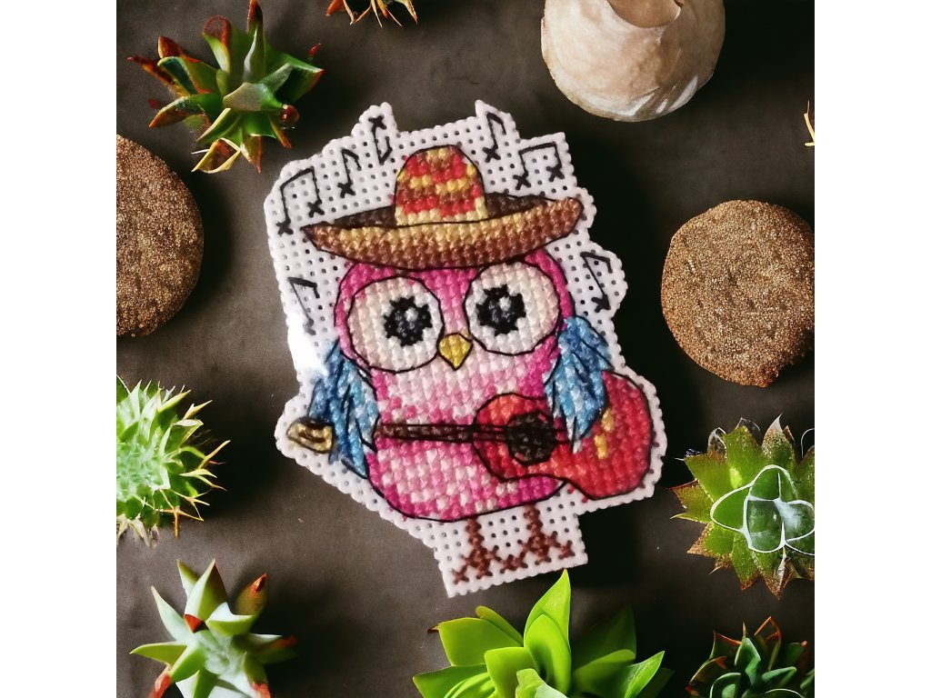 Křížková výšivka na plastové aidě, podlepeno magnetem, rozměr 9 × 6 cm.