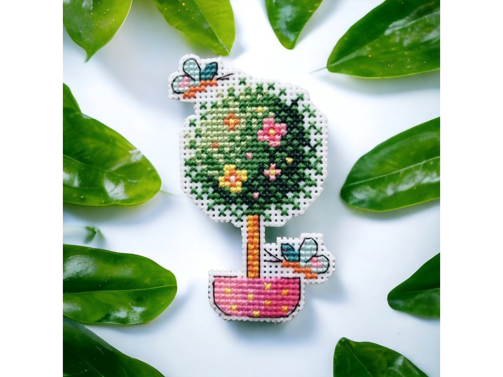 Křížková výšivka na plastové aidě, podlepeno magnetem, rozměr 9 × 6 cm.