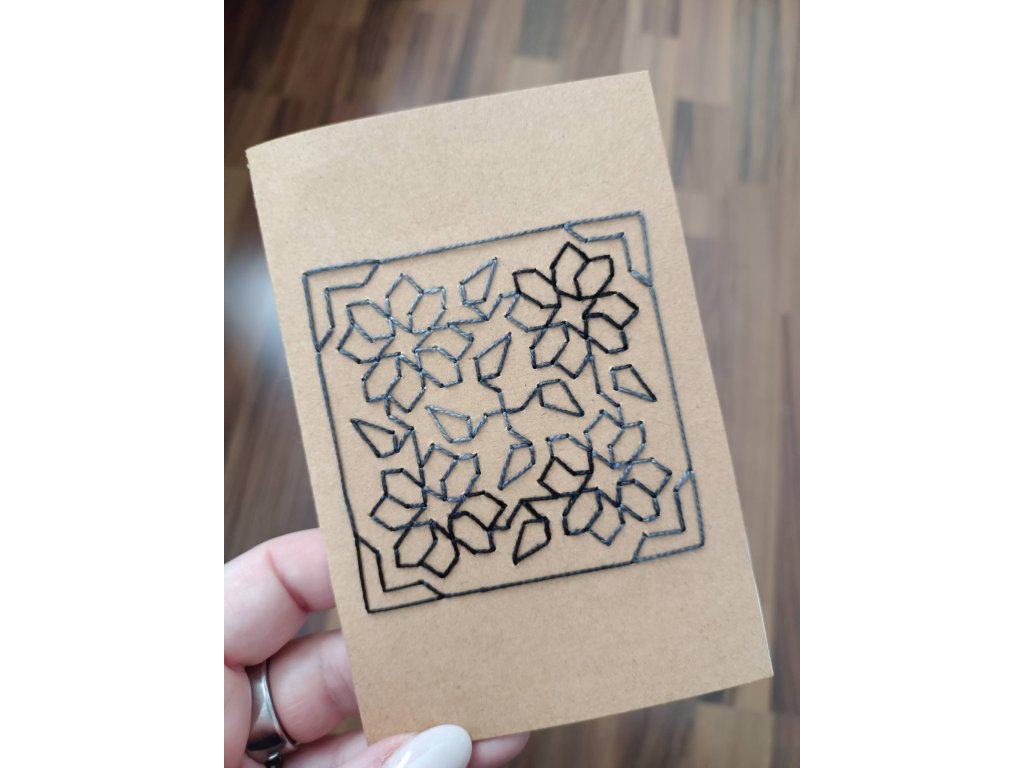 Rozměr sešitku je 12,8 × 8,5 cm. Má 18 linkovaných listů. Vyšito bavlnkou.